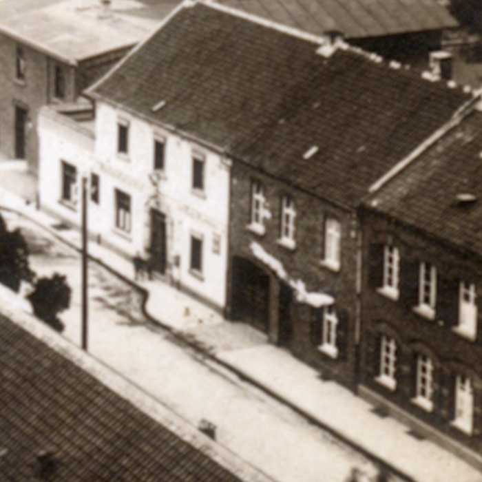 Büttgen – Blick um 1914 vom Kirchturm auf den Pampushof und auf die Bahnstraße, im weiteren Verlauf Driescher Straße. Auf der linken Seite der Büttger Bahnhof mit dem überdachten Eingang zur Bahnunterführung und im Hintergrund das Krankenhaus.